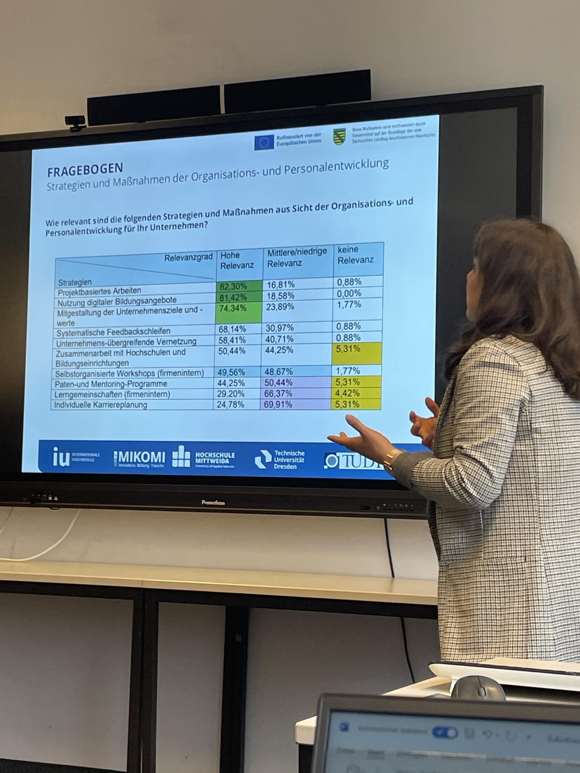 Die Projektpartner Hochschule Mittweida, Internationale Hochschule, TUDFaCE und TU Dresden präsentierten erste Ergebnisse aus Fokusgruppen mit Studierenden, Studienberatungen und Kammern sowie einer umfangreichen KMU-Befragung. Ein zentrales Ergebnis: Weiterbildungsinitiativen entstehen meist aus Eigenmotivation einzelner Mitarbeitender, während strukturierte Lernstrategien in vielen Unternehmen fehlen – trotz klar erkennbarem Bedarf.