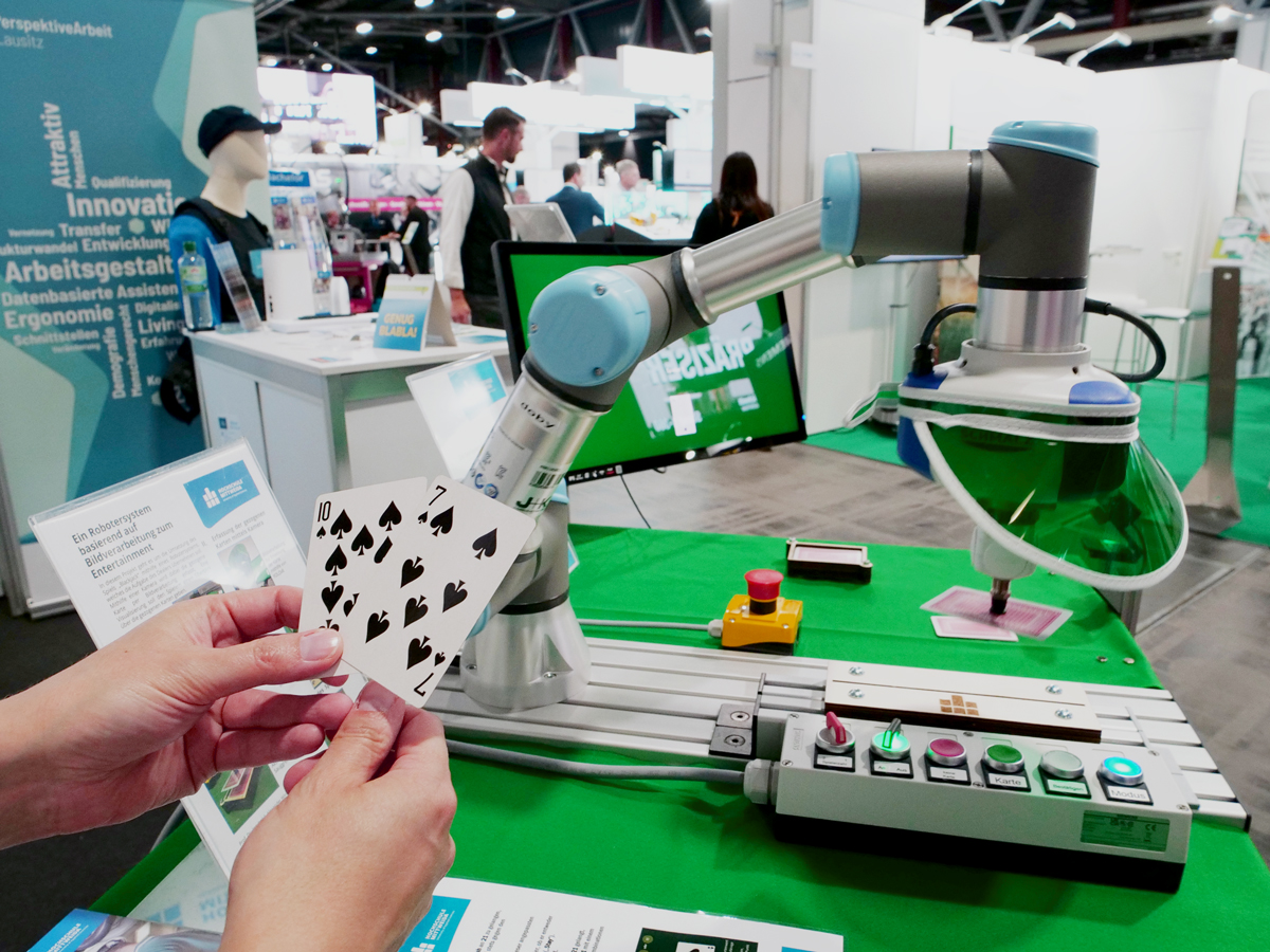 Ein besonderer Publikumsmagnet am PAL-Stand war in diesem Jahr ein kollaborativer Roboter, der beim Kartenspiel Black Jack gegen die Messebesucher antrat. Ausgestattet mit Kamera und Vakuumgreifer erkennt er die Karten selbstständig, berechnet mithilfe von künstlicher Intelligenz den nächsten Spielzug und spielt völlig autonom – ein spielerischer Einblick in die Möglichkeiten moderner Robotik.